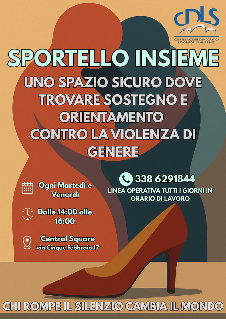 Alla Confederazione Democratica Lavoratori Sammarinesi nasce “Sportello Insieme”, un servizio dedicato all’ascolto e all’orientamento delle vittime di violenza di genere. L’iniziativa, presentata l’11 febbraio, si inserisce nel sistema di tutela già attivo in Repubblica con l’obiettivo di intercettare situazioni di disagio e accompagnare le persone verso la rete istituzionale competente.